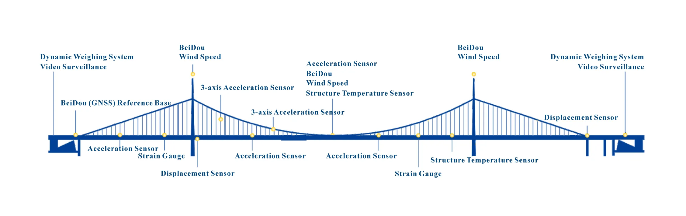 By deploying various sensors, data acquisition devices, and transmission equipment on bridge structures, long-term automatic measurement is conducted on the bridge's load effects, environmental effects, and structural responses. The measured data is transmitted to the cloud platform via wired or wireless communication technologies, providing customers with services such as remote bridge structure monitoring, online early warning, condition assessment, and decision support.