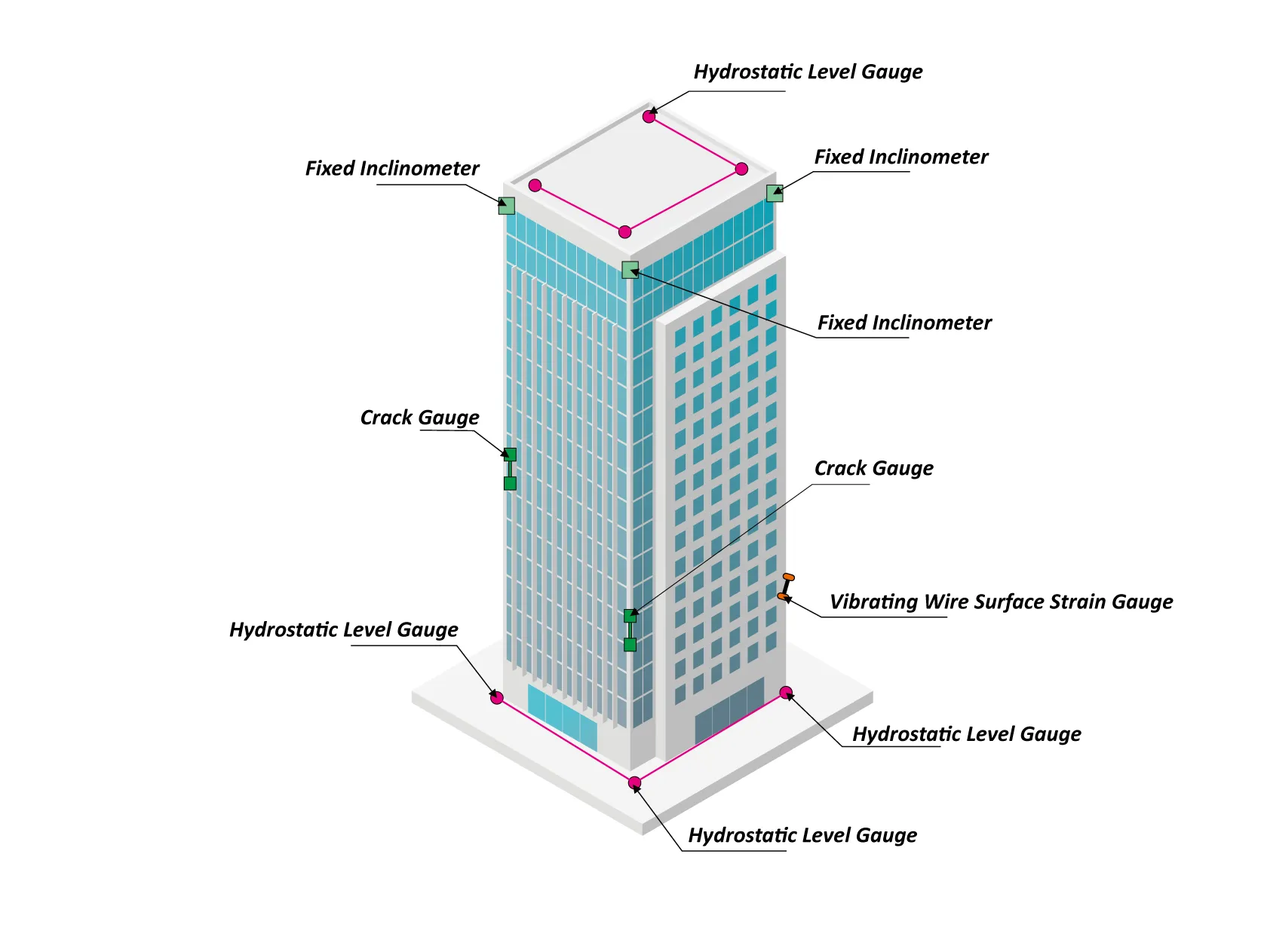 Structural settlement, structural crack, structural strain, structural inclination monitoring, etc.